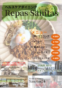 森山病院横のヘルスケアコンドミニアム「デュオサンテ旭川北彩都」内1階に、ヘルスケアダイニング「Repas Sanitas」(ルパサニタス)が営業しています。「食や栄養を通して、市民の皆さんや地域・社会の『健康生活』を支援していく」を、コンセプトとしており、メニューの一つとして森山病院管理栄養士が考案した「想いやりランチ」を週替わりでご提供いたします。 想いやりランチメニュー 2025.12.8~12.14 魚のにらネギソース 大根の生姜煮 味噌汁 フルーツ メニューの詳細はこちら 2025.12.15~12.21 えびと豆腐の辛味炒め 胡麻マヨネーズ和え 春雨スープ フルーツ メニューの詳細はこちら 2025.12.22~12.27 ミートローフ 揚げごぼうのサラダ コンソメスープ フルーツ メニューの詳細はこちら 2025.12.28~1.4 年末年始休業日 年末年始休業のお知らせ 下記の期間は休業いたします。 12月28日(日)~1月4日(日) ※1月5日(月)より通常通り営業いたします。 予防医学の一環として、糖尿病や高血圧症などの生活習慣病予防や、フレイル・サルコペニア予防など、未病の段階から健康について考え、はつらつと活動し、元気に長生き出来るメニューを考えています。 週 間 献 立 表 献立表 12/1~12/7 献立表 12/8~12/14 献立表 12/15~12/21 献立表 12/22~12/28 献立表 12/29~1/4 その他にも麺類やカレーなどの定番メニューもあります (下の画像をクリック) ルパサニタス内での栄養相談を受け付けています ルパサニタス内で栄養相談の受け付けをおこなっています。食事や栄養に関するちょっとした疑問など管理栄養士がご相談に応じます。詳細は下記をご確認ください。 ヘルスケアダイニングRepas Sanitas(ルパ サニタス)旭川市宮前2条1丁目1番6号 TEL/FAX:0166-73-6288 営業時間【朝食】 7:00 ~ 9:00(ラストオーダー 8:30)【昼食】 11:00 ~ 15:00(ラストオーダー 14:30)【夕食】 17:00 ~ 20:00(ラストオーダー 19:30)